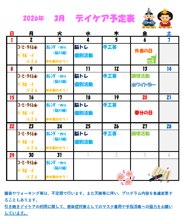 いわゆる日曜大工です。木材を使ってベンチなど作成します。また、デイケアにあったらいいものなど意見を出し合い、作成にチャレンジしてみます。
